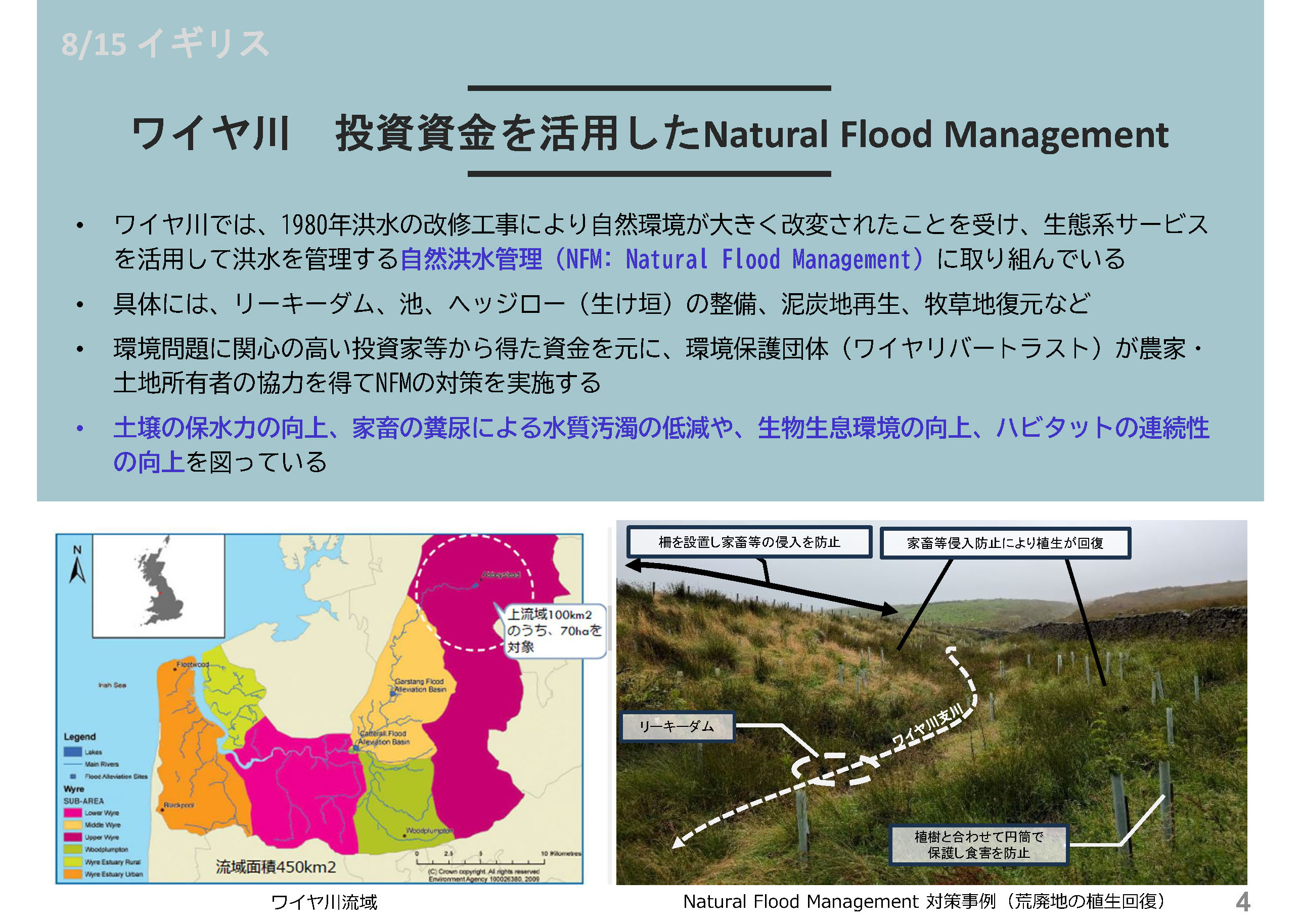ワイヤ川流域(図1)はイギリス中部に位置しており、生態系サービスを活用して洪水を管理する自然洪水管理(Natural Flood Management)に取り組まれています。 また、洪水管理のみならず、水質汚濁の低減、生物生息環境やハビタットの連続性の向上等を図っています。 特徴的なのは、環境問題に関心の高い投資家等から得た資金を基に対策を実施しているという点です。