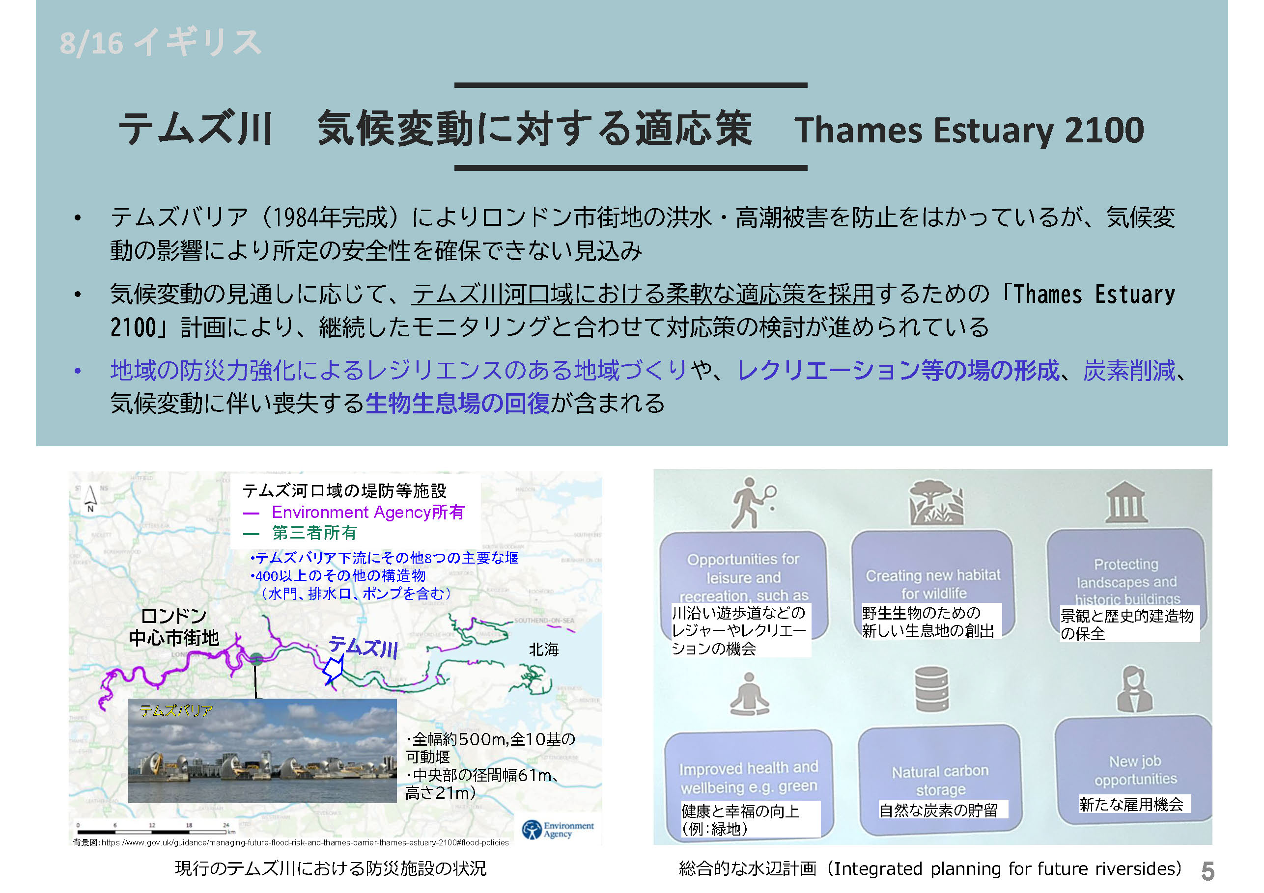 次に、ロンドンにてイギリスの政府関係者等の方との意見交換を行いました。 テムズ川では、気候変動の見通しに応じて、河口域における柔軟な適応策を採用するための「Thames Estuary 2100」計画(図2)によって、継続したモニタリングと合わせて対応策の検討が進められています。 レジリエンスのある地域づくりだけでなく、レクリエーション等の場の形成、CO2削減、気候変動に伴い喪失する生物生息場の回復等の総合的な計画が検討されていました。 また、チョークストリームという湧水起源の河川が、特にイギリスで特徴的に見られるのですが、流域ベースの水環境再生戦略アプローチということで、流域内の関係者とパートナーシップを形成し、協働しながら事業を実施しているというお話を伺いました。