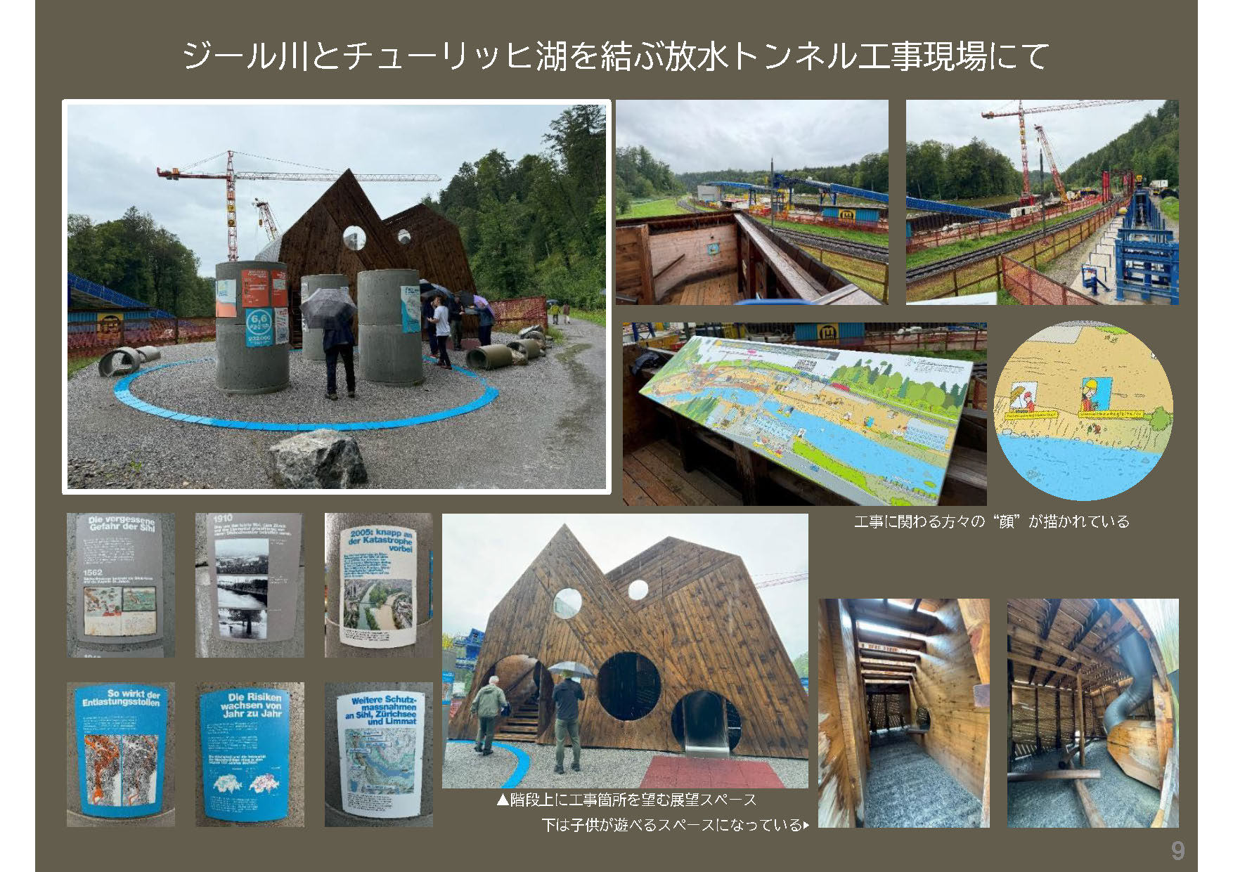 まず、チューリッヒ市街地を流れるジール川ですが、市街地の浸水への懸念から治水計画が検討され、治水対策と自然環境への代替策、再自然化が実施されています。 印象深かったのは、工事現場脇の広報施設(図4)です。 2階から工事現場が見渡せるようになっています。 親しみやすいイラストで工事の概要が描かれていたり、過去の災害や工事の効果がビジュアルに説明されていたりしました。 子供が遊べるようにもなっていて、散歩の合間に立ち寄れるような場所でした。