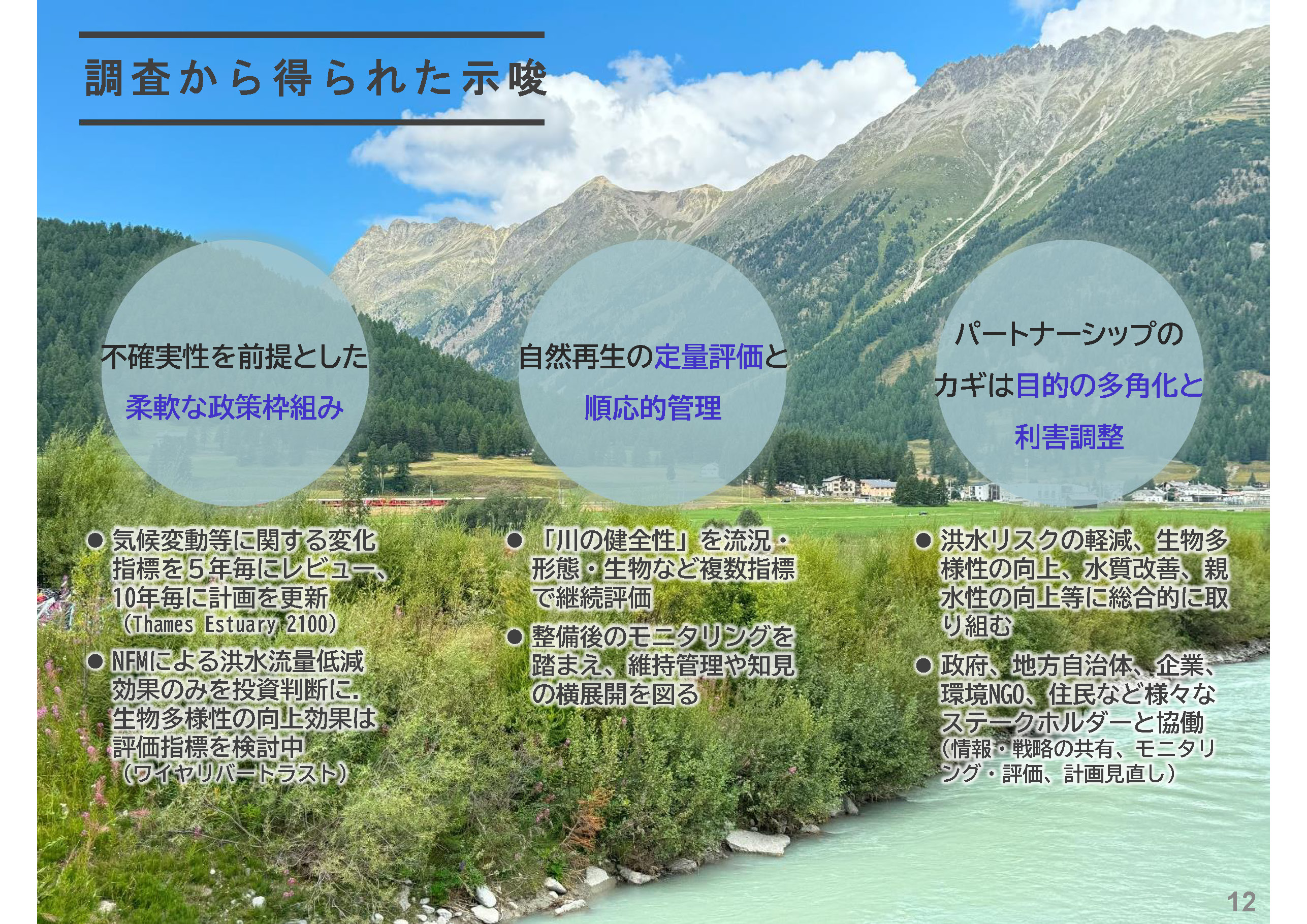 2つ目は、特にスイスですが、自然再生について定量的に評価し、結果を踏まえて継続的に維持管理する。 また、知見の横展開を図っていました。 技術者の育成により、次世代につなげていくということも印象深かったです。