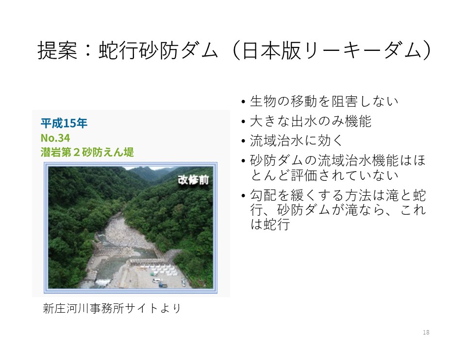 最後に、リーキーダムに関して、日本にもそれに似た砂防ダムがあります。 新庄河川事務所のwebサイトに掲載されていますが、砂防堰堤をずらして配置しています(図13)。 普段の流れは途切れず生物の移動を阻害しません。 大出水では土砂を受け止めるのに加えて、おそらく流域治水としても効果があると思います。 河川地形学の基本からいうと、急勾配を緩くする方法は、滝か蛇行です。 砂防ダムや治山ダムの治水機能はほとんど評価されていませんが、滝を作るということなので流域治水にも効果があると思います。 もう一つは蛇行なので、ここで紹介した言わば蛇行砂防ダムは理にかなっていると思います。 全くのアイデアですが、こういったことも考えてはどうかということを紹介して終わりたいと思います。