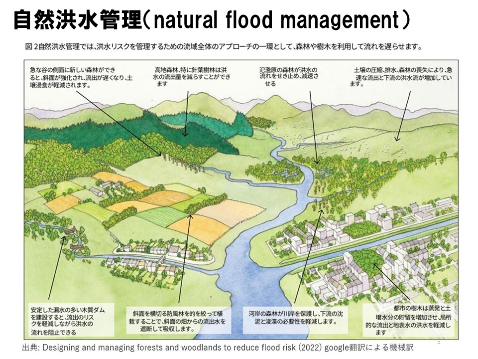 自然洪水管理(図2)の手法には全部で14くらいのメニューがあります。 例えば、小さな自然再生のように、木の小さな堰をいっぱい造って流れを遅くするリーキーダム、また、イギリスは草原が多いので、日本と違って木を植えると降雨遮断や流水阻害になります。 グリーンインフラ的に都市に緑を増やすとか、生け垣のようなグリーンの帯を造ることで斜面の流れを緩やかにするヘッジローもあります。