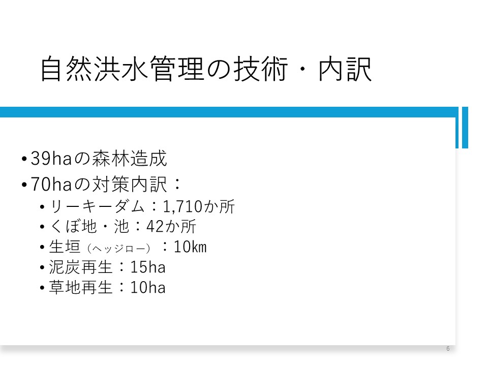 ここでは1/50規模の洪水を20年間に4度も被り、それを契機にして自然洪水管理が始まりました。 ワイヤ川流域は、保全対象もそう多くないので、本格的な治水事業は難しい。 なるべく低コストな治水をやろうということで、グリーンインフラの活用、自然洪水管理を実施することになりました。