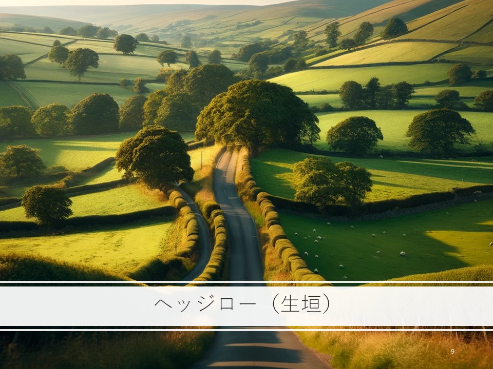 ヘッジロー(図6)は、イギリス映画の草原にある生垣のようなものです。 十勝平野の防風林のイメージでしょうか。 動物のすみか・通り道になっていて、エコロジカルネットワークを形成しているそうです。 第二次世界大戦直後は48万kmもあったのが、現在では大きく減少しています。 ヘッジローは、生態系にも効くし、斜面の流れの阻害にもつながるので、いま、積極的に再生されているそうです。