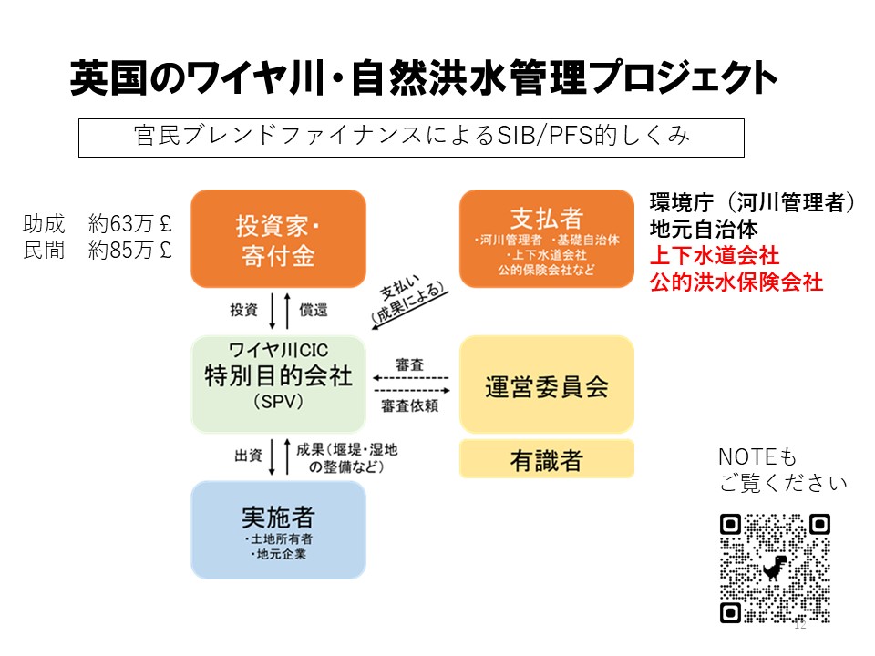 その資金を特別目的会社(SPV)に預け、そこから現場で実施する実施者に渡されます。 実施者は河川管理者ではなく、ワイヤ川トラストというパートナーシップ、チャリティー、NPOのような団体です。 このトラストの職員は今、15人程度なので、日本の出先事務所のようなイメージです。 実施した結果をモニタリングし、成果を報告します。 その成果(治水や生態の効果)は運営委員会が審査し、認められれば支払者がお金を払うという仕組みです。 支払者は、日本で考えると国交省などの河川管理者になるのでしょうが、ワイヤ川では、河川管理者と地元自治体に加えて、上下水道会社と公的洪水保険会社が入っているというのが面白いところです。 このPFSの仕組みは、日本でも福祉関係などで結構やっていて、最近は、前橋市の馬場川通りなど、まちづくり関係も増えています。