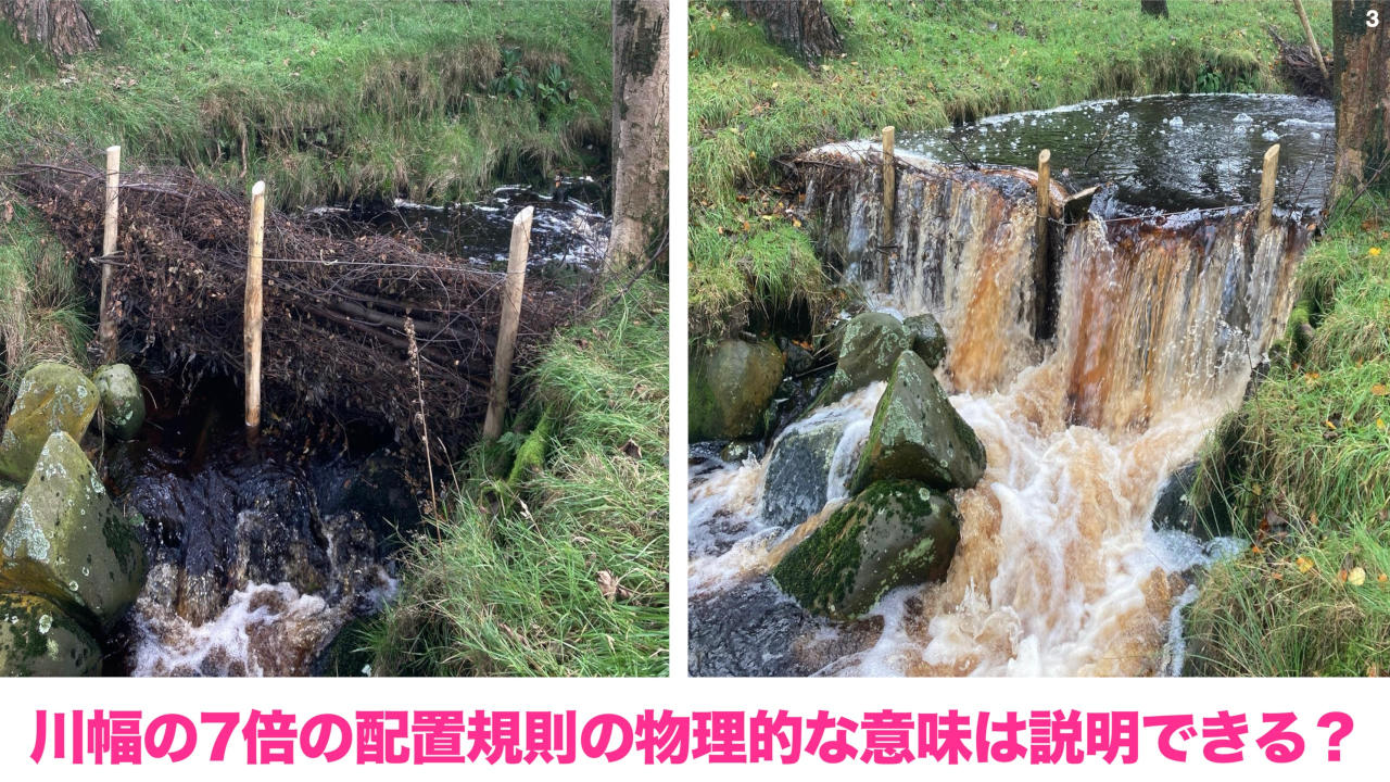 イギリスでリーキーダム(図1)を調査した際、リーキーダムの縦断方向の配置間隔をどうしているのか聞いたところ、河川工学の知見に基づいて大体川幅の7倍ぐらいに設置しているということでした。 これは、河川の設計の際の砂州の波長に該当するとされているのですが、その一方、なぜ7倍になるのかはっきり説明している人はいなくて、この時代だからこそ川の物理の理解をもう一段階深める必要があるのではないかと現地で考えました。