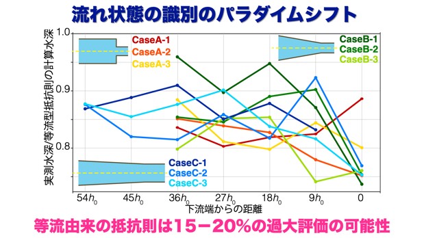 そしてもう一つ面白いのが、横軸に下流からの距離、縦軸に実測水位とiRICによる計算水位の比較をすると(図10)、今回実験したどの条件においても平均して縦断水位がおよそ15~20%下がることです。 予想では、ハの字状の流路は等流、今までの常識に近い流れに近づくかと思いましたが、結局のところ、加速状態が一定以上に介入したときには層流状態に近い、乱流の介入が自由流に及ばないような流れになり、等流由来の抵抗則に比べて15~20%水深が浅くなるということが分かりました。