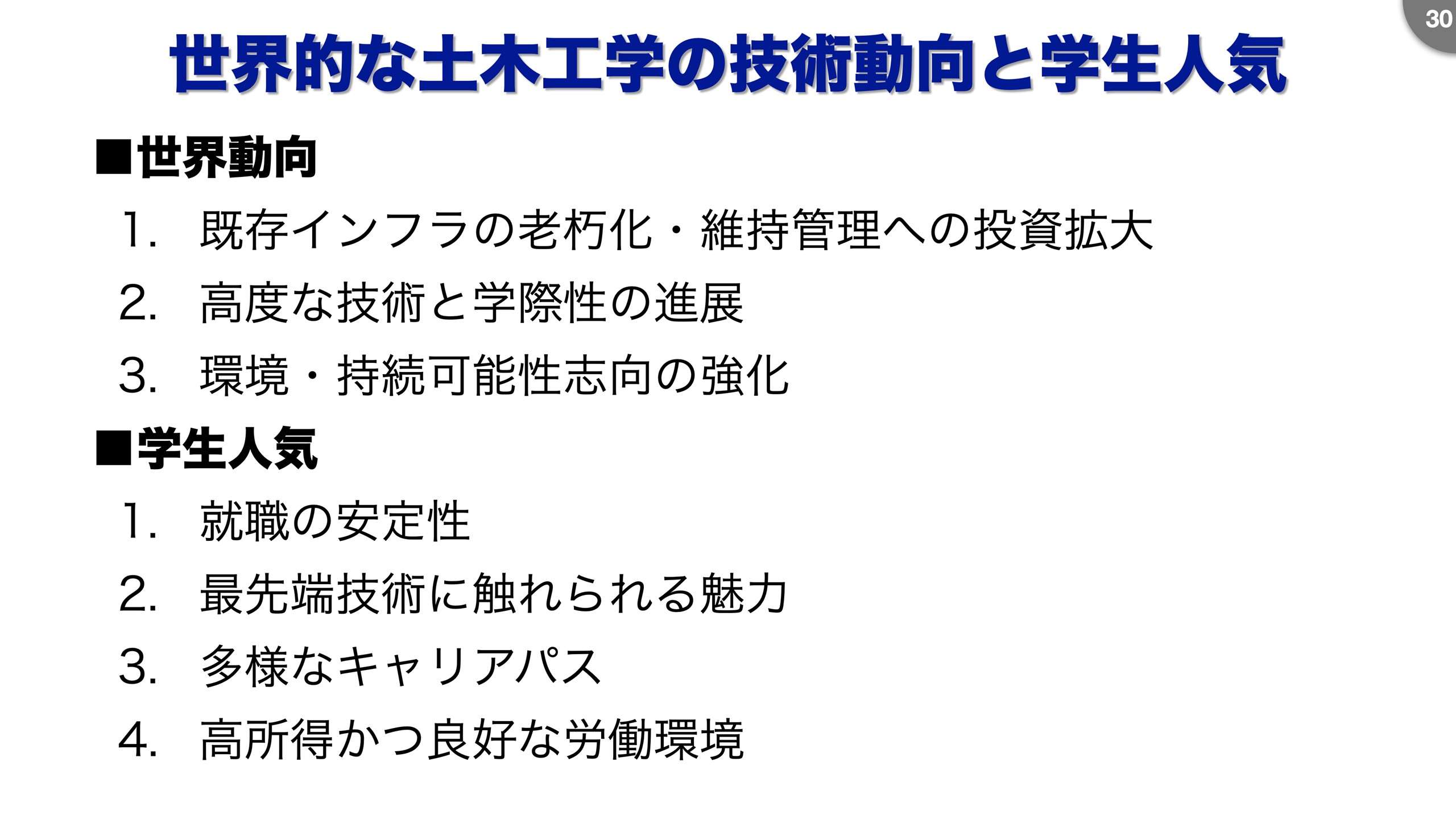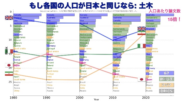 世界的に日本の土木の研究水準を見ると、2000年頃までは国際ランキングトップ5ぐらいでしたが、今はもう20位を下回る状況で、非常に低い順位です(図14)。 この状況だと、学生にも選ばれません(図15)。 治水と環境保全を一緒にやる新しい時代が来ているのですから、河川業界全体でこれを目玉となるように盛り上げることが大事だと思います。