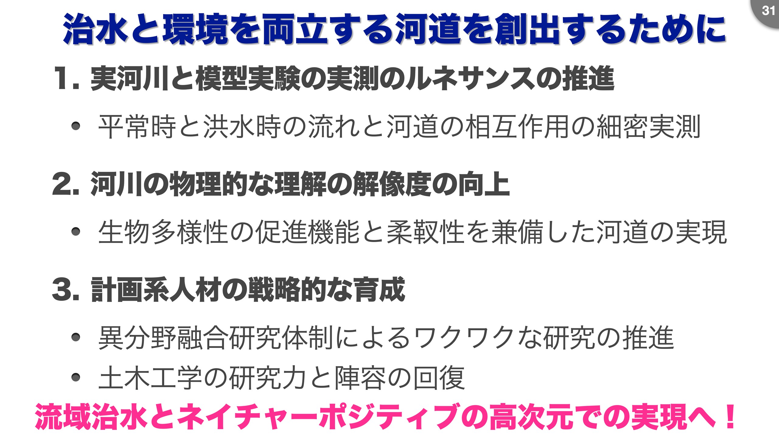 最後に、測ることは大事ということを強調します。 それによって、生物多様性の向上や、私は治水の機能を柔靱性という、固めるだけじゃなくて粘りを持つことが、堤防だけではなく河道でも大事だと考えています。 河道の理解ができれば、技術的には治水と環境保全を両立した河道の設計を達成できると思います。 そうすることで、河川技術の上流に位置する計画系の人材を育成でき、技術力や研究力が回復し、流域治水とネイチャーポジティブの実現が高次元にできると思います(図16)。