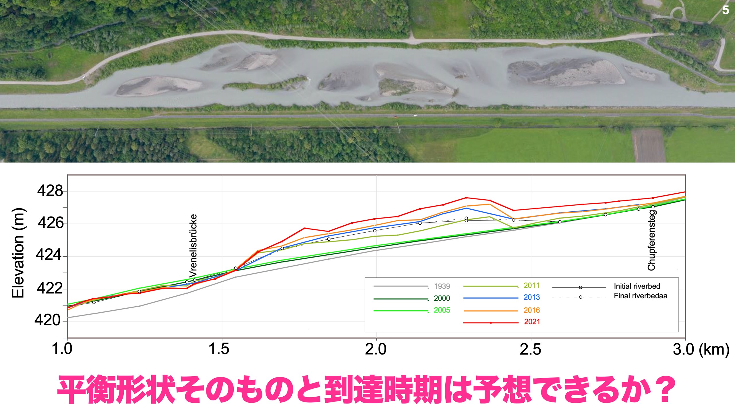 スイスのリント川(図2)の河道拡幅箇所では、想定を上回る速度で堆積が進んでいるとの話を聞きました。 この想定していた川の平衡形状やその到達時期をどう予測できるのかというのも研究対象になりうると現地で考えました。