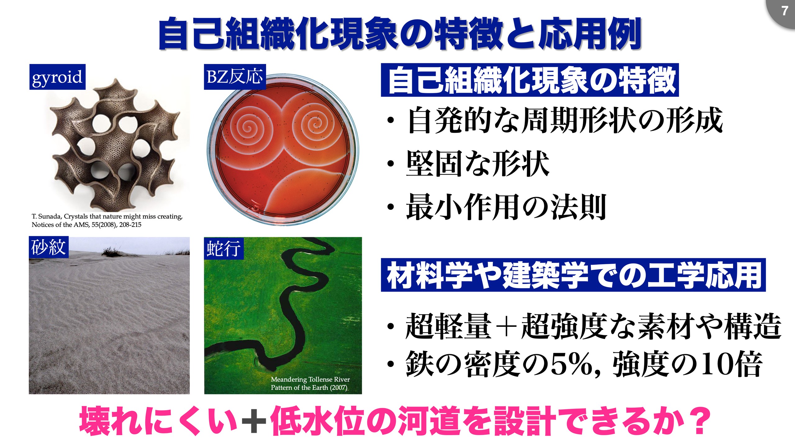 自己組織化現象とは何かということですが、同一の力が作用したとき、その結果として同じ形(カタチ)ができる、そういう自然現象のことを自己組織化現象と言っています(図4)。 化学の分野から言われ始め、生物学や力学の一部で使われ、材料学や建築学にも広がりました。 河川工学ではまだ明示的に使われた前例はないと思います。 自己組織化現象の特徴は、周期的な形ができ、それが力学的に安定していること、力の作用が最小になるというものです。