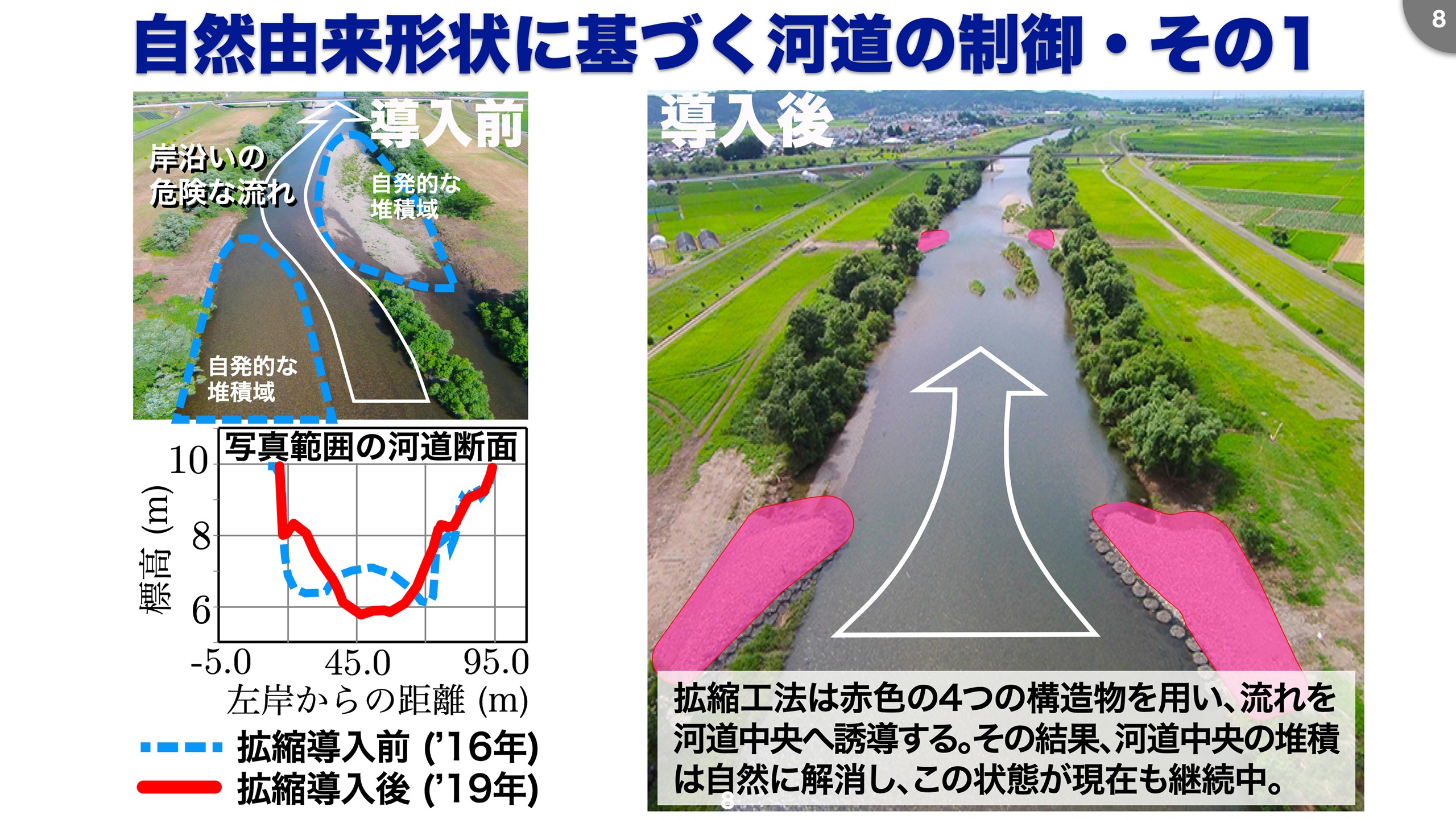 今回、イギリスとスイスでは、ネイチャーポジティブの関連事業を見ました。 そこに治水が不在なわけではなく、治水と環境保全を両立する技術が作られていました。 こういう目的を実現するために、私は、8年ほど前から、北陸地方整備局管轄の河川で「自己組織化現象」という生物学でよく使われているキーワードに着目し、「拡縮工法」という河道の制御の開発に取り組んできました。 これが成功しているので、一つ目の話題として、今回の調査で見てきた環境保全の実装法の一つとして話します。