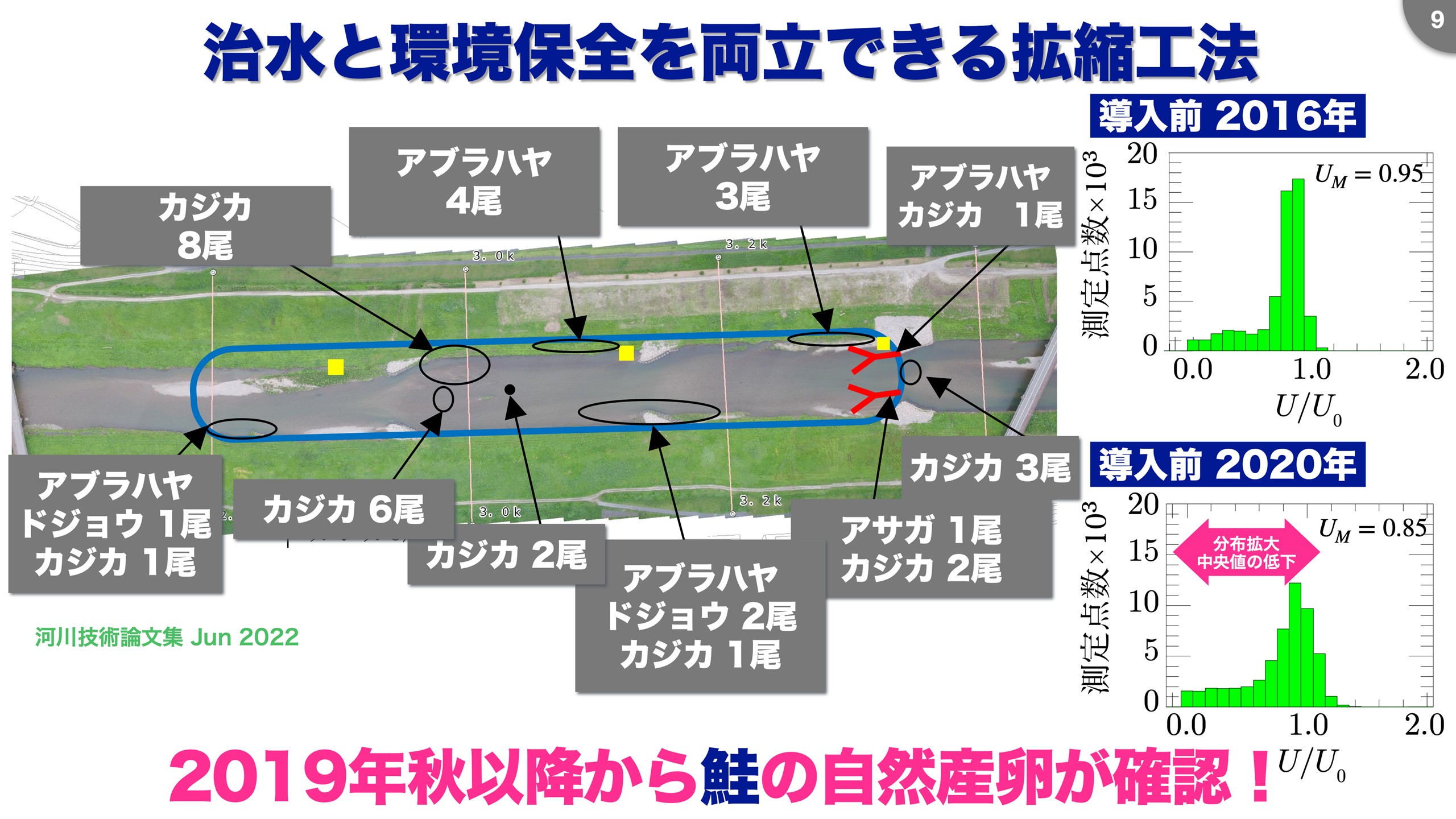川の分野で自己組織化現象の最も典型的なものは、蛇行だと思います。 丈夫な形ができ、エネルギーの作用が最小になるという性質から、川に自己組織化現象を適用した場合のメリットとしては、洪水が流下しても壊れにくい、安定した形ができ、同じ流量での水位が下がる可能性があると考えています。 私は、2016年頃から、阿賀野川支川の早出川で、捷水路事業で直線化した河道に対して、羽根のようなものをつけ、川幅を増減する仕組みの実証実験をしています(図5)。 その結果、2つのメリットが得られました。 川幅の増減をさせることで、洪水時は砂州ができずに断面中央に流れが集まる、そして、流速と水深の空間分布が広くなることで、生物の種数も増えました(図6)。 もともとは速い流れを好む魚が多く棲んでいましたが、川幅の増減を組み込むことで緩やかな流れを好む魚と植物が帰ってきました。 事業開始から3年後の2019年から、鮭の自然産卵が20年ぶりくらいに見られました。 治水と環境保全の両立ができる工法であるため、国内の河川にも広がるといいなと思っています。