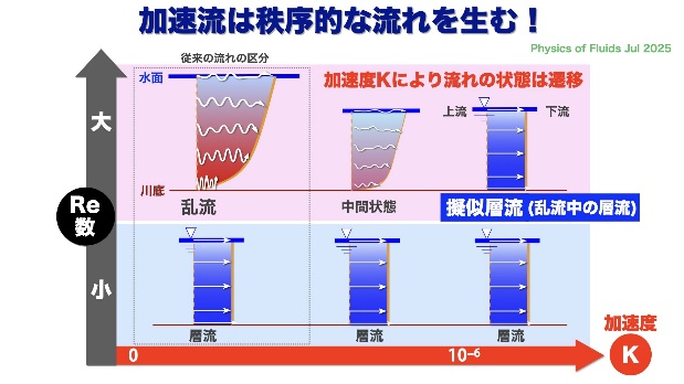 総合すると、これまでは川底の不安定性や対数則を重視してきましたが、まず、加速が一定以上作用する場合には対数則から逸脱することがあり、また、水面に河川を不安定にするきっかけがあったりということが見えてきました。 こういうものを組み合わせると、乱流そのものや河道を制御できるという新しい河川工学が開拓できると考えています。