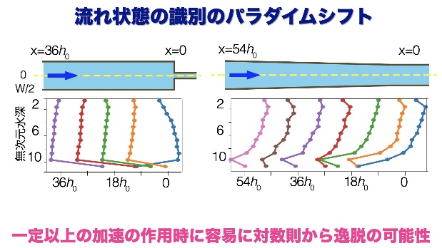 レイノルズ数について、流れの状態を層流か乱流か、秩序だった流れか、乱れが卓越した流れかに分ける指標だと学びます。 しかし、実は数学ではもう40年ぐらい前に、レイノルズ数で十分に乱流の領域の中においても、ある加速を与えた場合には乱流にも層流にもなるという特性があることを予言されていました。 乱流の場合には、よく教科書に出てくる対数型の流れができます。 ところが、川幅を下流に向かって狭めると流れが加速し、その度合いによって、対数型の分布から真っすぐに直立した分布まで連続的に変化します(図7)。 直立した分布というのは、底面で発生した乱れが自由流の中に介入せずに重力だけで流れる状態になるので、対数型に比べ、15~20%程度の水深の低減効果も分かってきました。