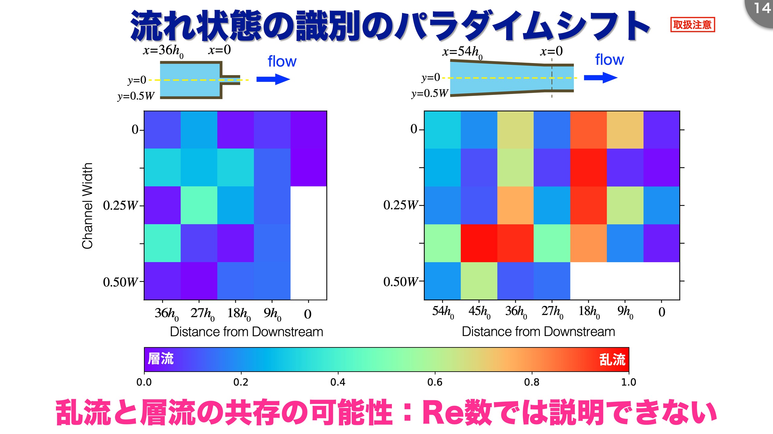 乱流状態か層流状態かを判別する相転移の力学に基づいて乱流、層流の識別をすると、急縮の場合は測定領域全体が乱流状態になります。 一方、ハの字状の流路では、平面的に見ると、パッチ状に乱流、層流が入り交じる流れになり、レイノルズ数では簡単に説明できない流れが形成されることが分かりました(図9)。