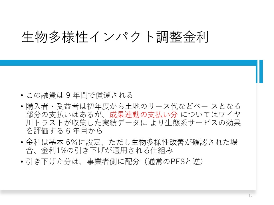 ワイヤ川では、幾つか面白いことをやっています。 生物多様性インパクト調整金利(図10)というのがあります。 購入者・受益者は初年度から土地リース代などベースになる部分は支払いますが、成果連動の部分は、データを取って、その成果によって支払います。 生態系サービスの効果は、治水や炭素なども含まれていますが、6年目から評価します。 金利は基本的に6%ですが、生物多様性の改善が確認された場合には1%引き下げて5%になるのが面白いところです。 うまくいくと投資家が損をする仕組みになっていて、通常のPFSでは成功したら例えば金利6%が9%などに増えるのですが、逆の仕組みです。 これは投資家達が環境に貢献したいと思っていることで成り立っています。 金利が下がって浮いた資金は、実施者に渡りさらに環境改善が進むということになります。