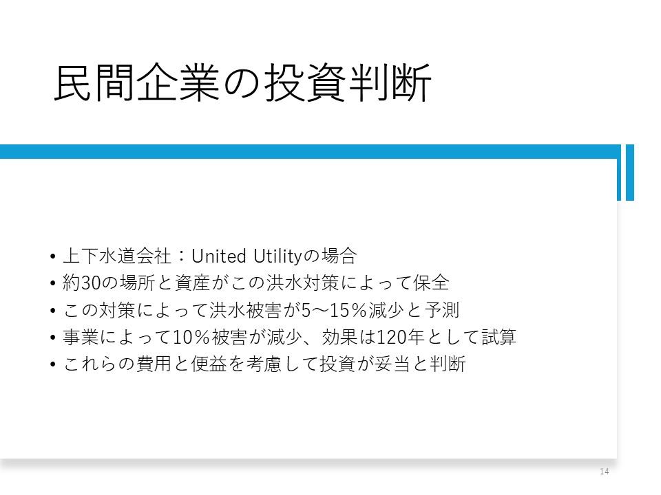 支払者には上下水道会社のUnited Utilityが入っています。 その理由を簡単に言うと、公共事業費のみで進めるよりも、自分がお金を出して事業を進捗させた方が得になるからです(図11)。 河川周辺の上水や下水の処理場などの施設を保全したいということです。 対策によって洪水被害が5~15%減少すると算出されたので、間をとって被害減少を10%とし、効果が120年間持続するとして試算し、経営陣が投資の判断をしたということです。