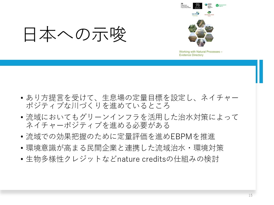 日本でも今、あり方提言を受けて、ネイチャーポジティブな川づくりを進めているところです。 流域でもグリーンインフラを活用した治水対策によってネイチャーポジティブを進めていく必要があるのですが、EBPM(Evidence Based Policy Making)を進めるうえで、効果の定量把握を、治水はもちろん、生態や水質浄化などでも行う必要があります(図12)。 イギリスがすばらしいのは、エビデンスの資料集を作っていることです。 論文を集めて分かりやすくして、それを見ながら効果を試算しています。 また、生物多様性クレジットのような仕組みも検討していくことが必要だと思います。