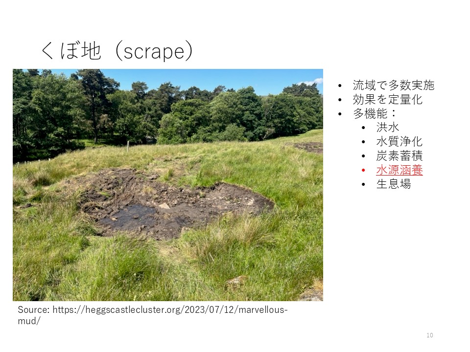 窪地(図7)は、英語でscrape(削る)と言います。 大きなものから小さなものまでありますが、流域でたくさん実施しています。 小規模なものをたくさんやる、しかも、小さいものまで効果を定量化し、論文にもなっています。 また、多機能性を持たせています。 洪水対策にもなる、窒素、リンを除去できる、水質浄化対策にもなる、炭素蓄積にもなる、水源涵養にもなる。 湿地になるので生物の生息場にもなります。