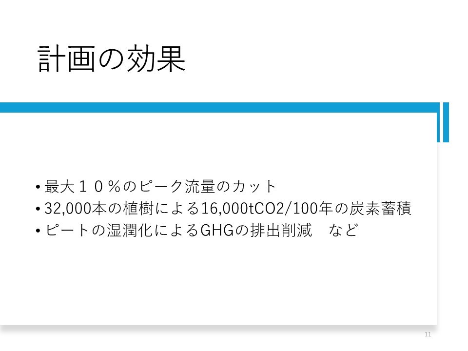 対策の効果(図8)は、ワイヤ川流域では様々な研究が行われていて、最大10%のピーク流量カットになると言われています。 また、炭素蓄積は、32,000本の植樹によって16,000tCO2/100年となっています。 乾燥した泥炭はCO2を多く出しますが、湿ると出にくくなるため、泥炭の湿地化は、温室効果ガスの削減に繋がります。