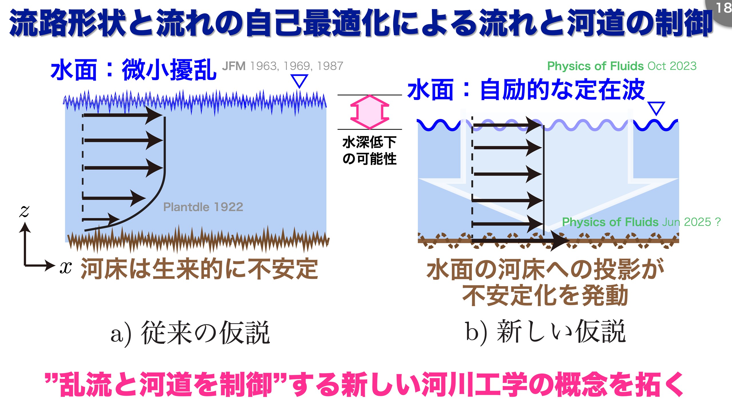 総合すると、これまでは川底の不安定性や対数則を重視してきましたが、まず、加速が一定以上作用する場合には対数則から逸脱することがあり、また、水面に河川を不安定にするきっかけがあったりということが見えてきました。 こういうものを組み合わせると、乱流そのものや河道を制御できるという新しい河川工学が開拓できると考えています。