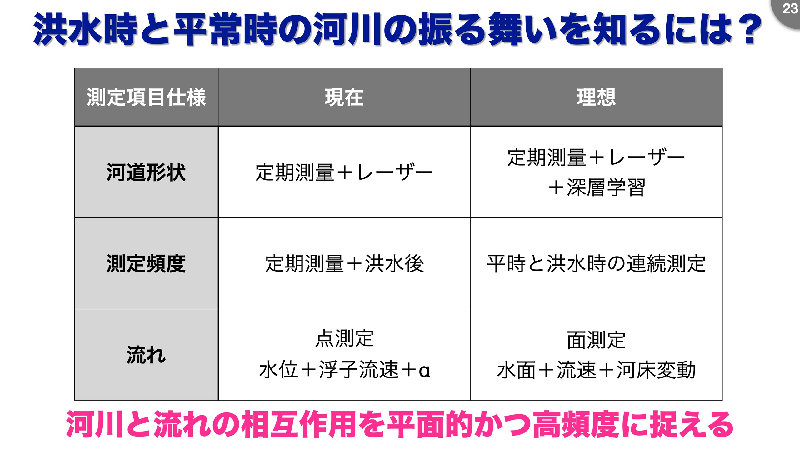 最近、様々な分野で深層学習が威力を発揮している話を聞きますが、先ほどの方法で水表面の流速の平面分布を測定し、それを教師データとした深層学習 (Physics-Informed Neural Networks:PINNs)により、未観測の河床を4~5%程度の精度で推定する方法も開発しました。 このように、平常時と洪水時の川の流れを理解する技術は随分出揃ってきました(図13)。