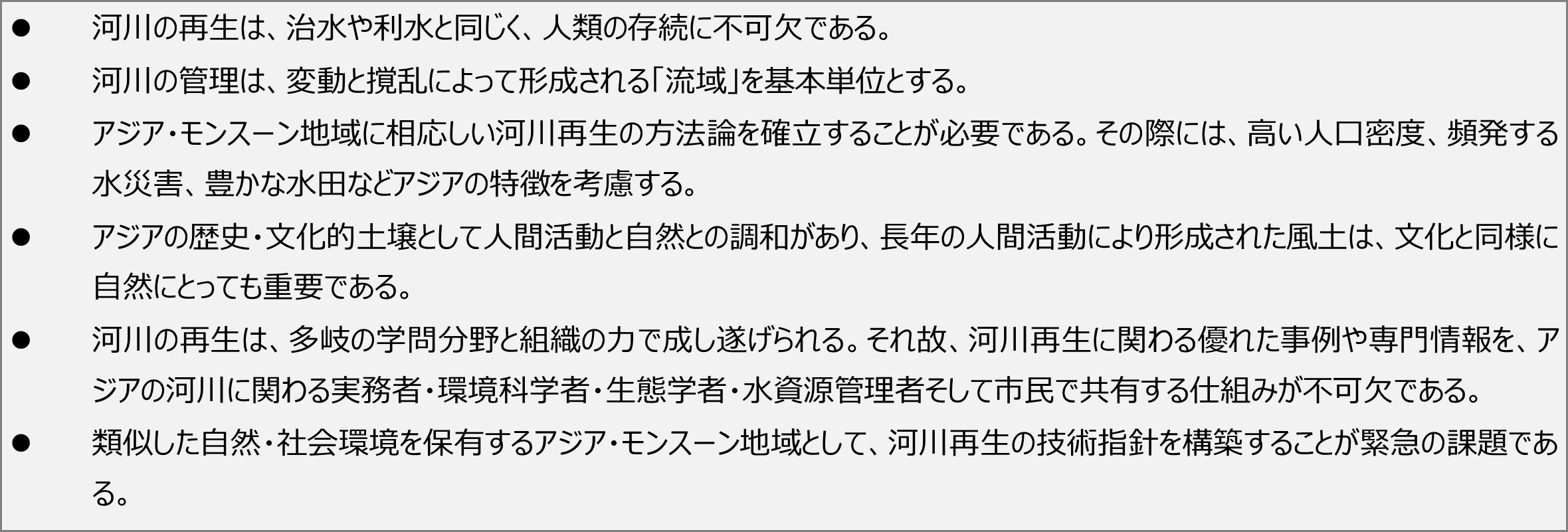 この提言の具現化を目的に、日中韓が「アジア河川・流域再生ネットワーク(Asian River Restoration Network: ARRN)」を2006年11月に設立し、同時に日本にARRN窓口機関として日本河川・流域再生ネットワーク(JRRN)が設立されました。